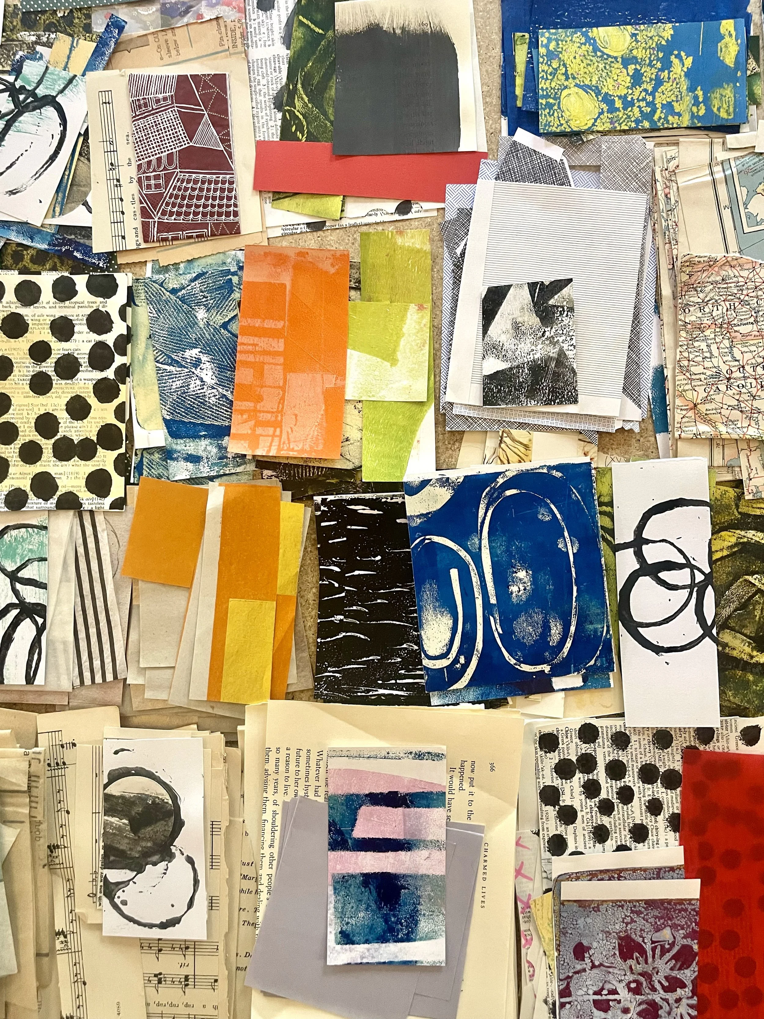 A Mix of Abstract Collage Papers Included in the Kit: Handmade Paper, Original Gelli Plate Art, Recycled Paper, Found Paper, Vintage and/or New Magazine Imagery, Pieces of Original Paintings, Drawings, and Prints, Old Book Pages, and more! 30+ pieces come with the 6x6 and 45+ with the 10x10.